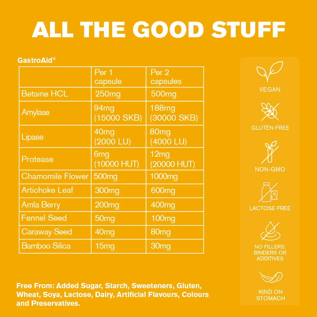 GastroAid® is an advanced formula of betaine, digestive enzymes, and botanicals to regulate stomach acid and the efficient breakdown of food, maintaining balance and comfort in the digestive system. GastroAid® also includes chamomile and fennel for the soothing of the digestive tract, providing a carminative effect on spasms and flatulence.