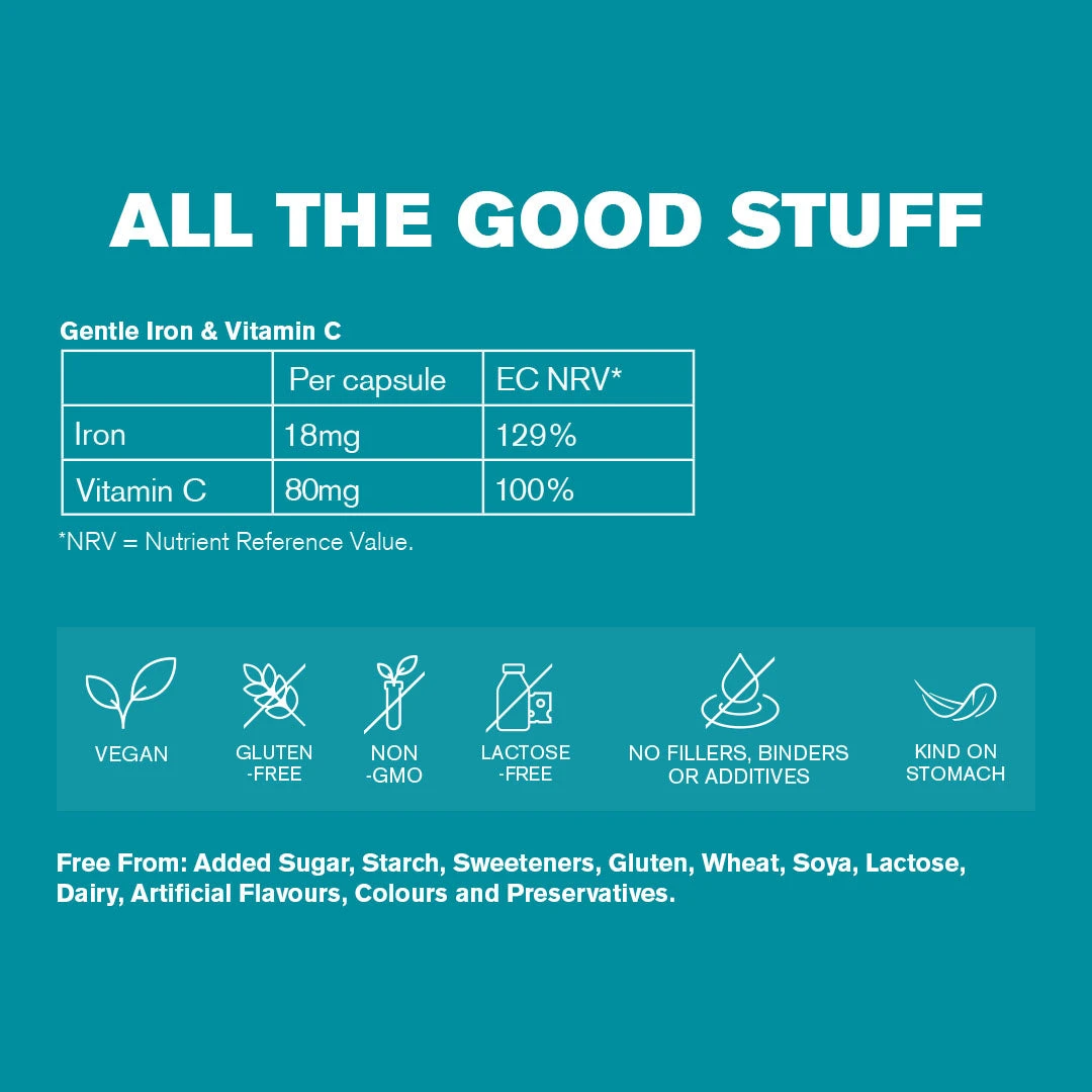 Our Gentle Iron (18mg) is combined with Vitamin C (80mg) for maximum absorption. Iron is an essential mineral for cognitive function, concentration and a healthy mood. Iron deficiency can lead you to feeling low on energy, anaemia, and is more common among women and those on plant-based diets.