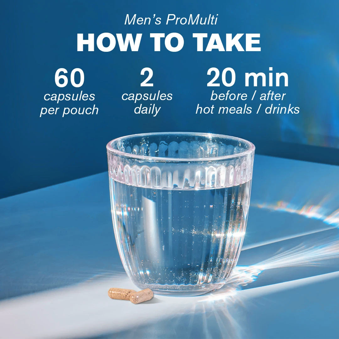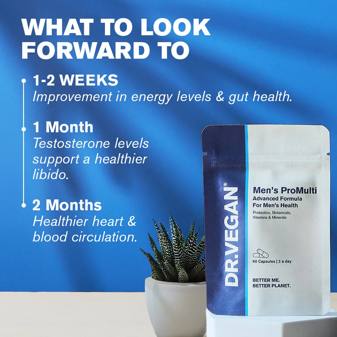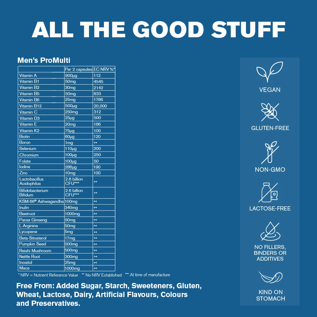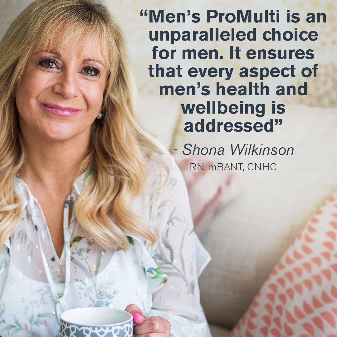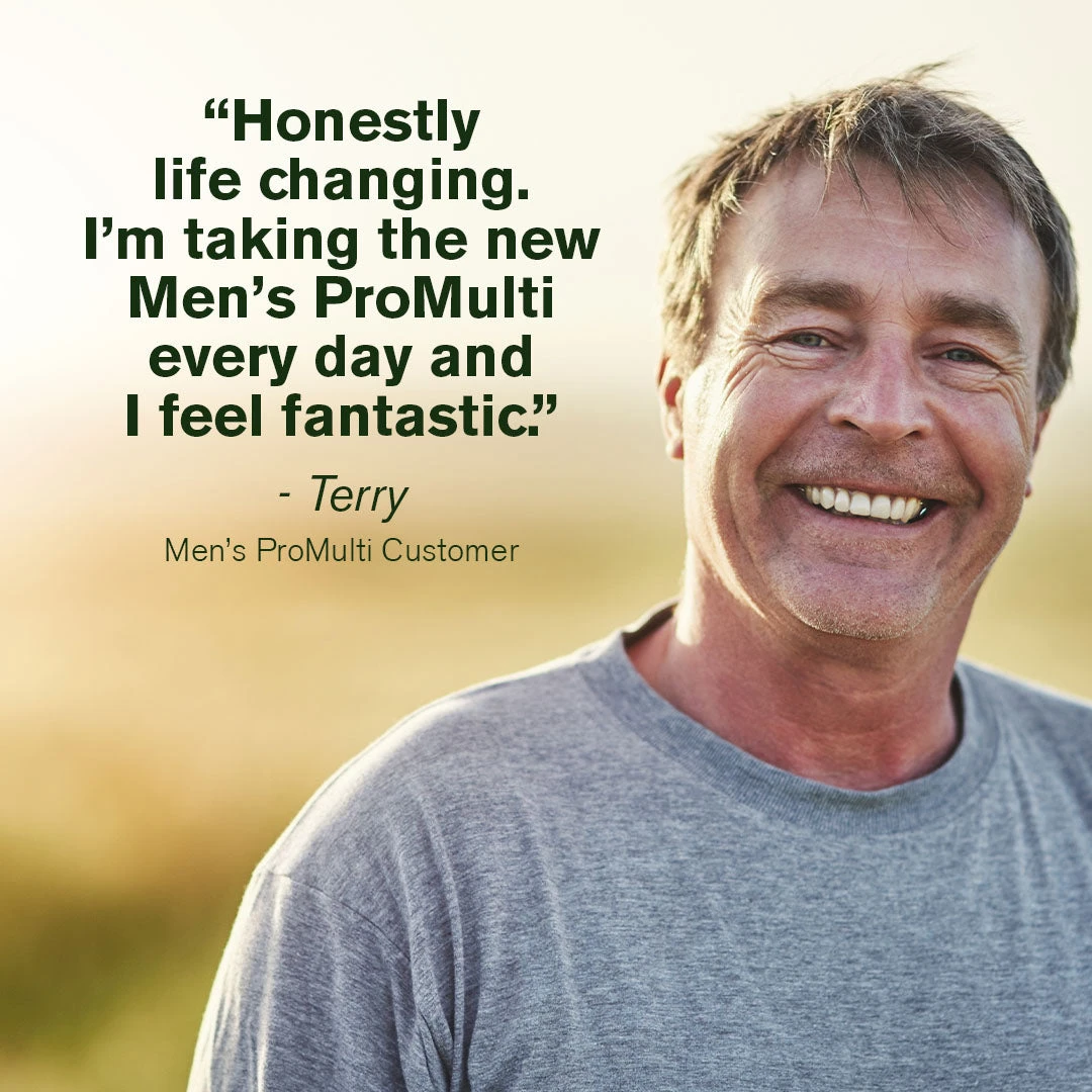 Men’s ProMulti is the uniquely comprehensive, all-in-one formula of live cultures, prebiotics, botanicals, amino-acids, vitamins and minerals to support the changing health needs of men over the age of 45. It is specially formulated to support prostate health, gut health, testosterone health, daily vitality and wellbeing.